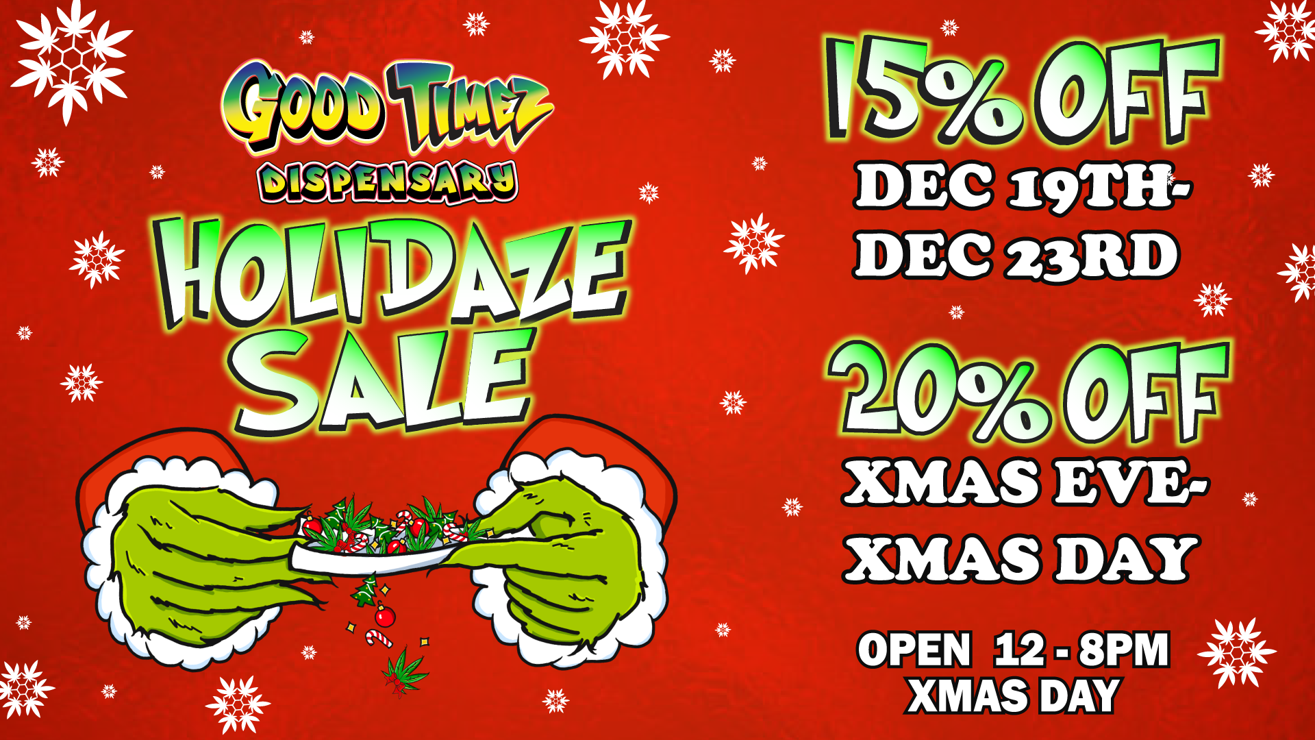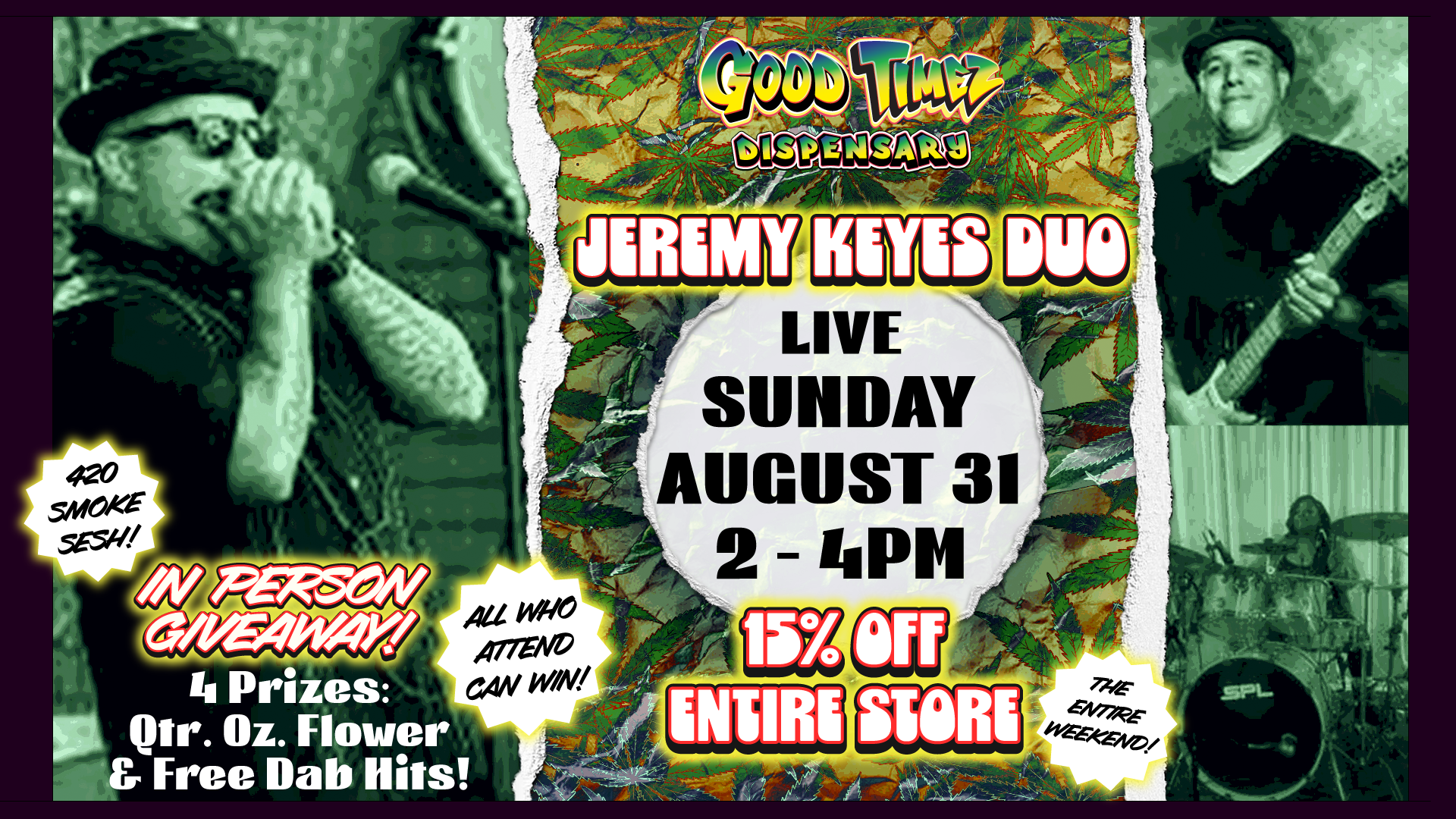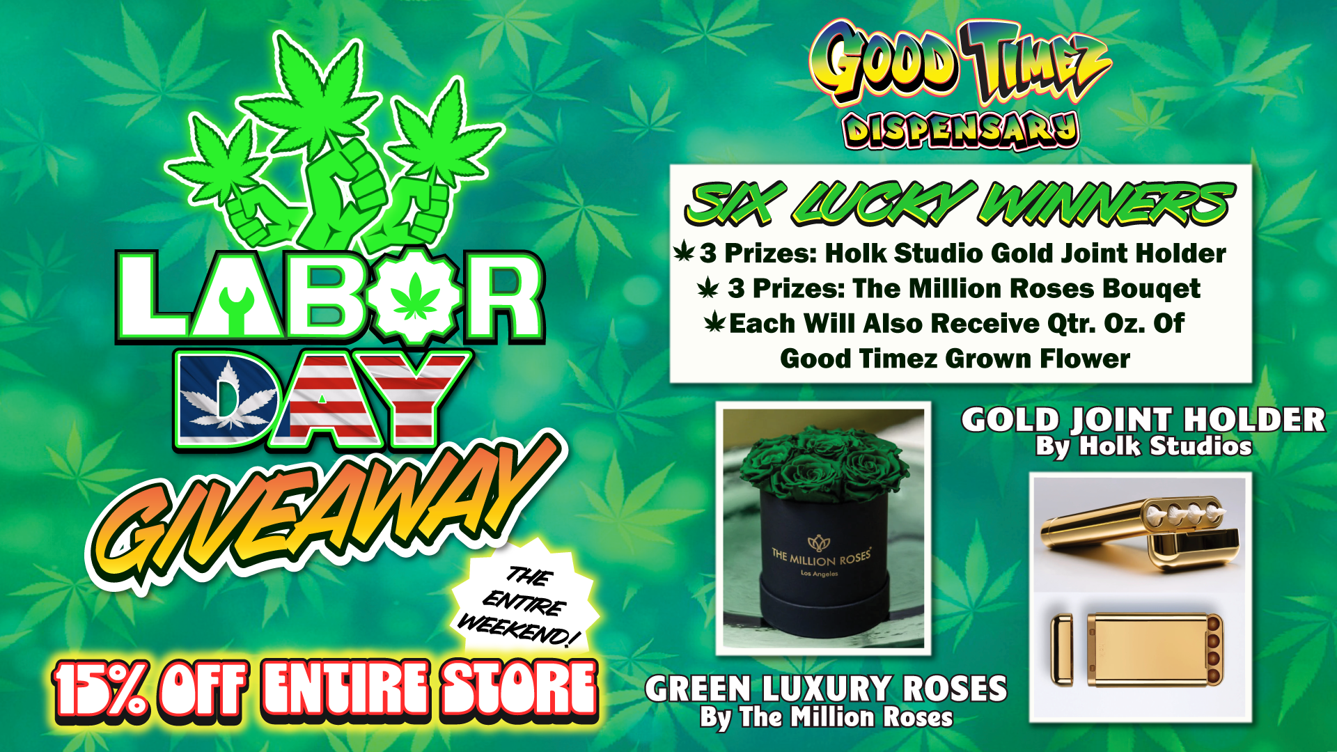 Good Timez Dispensary's Labor Day Weekend Sale! August 29th - August 31st 15% OFF THE ENTIRE STORE! Stop in and put your name into the